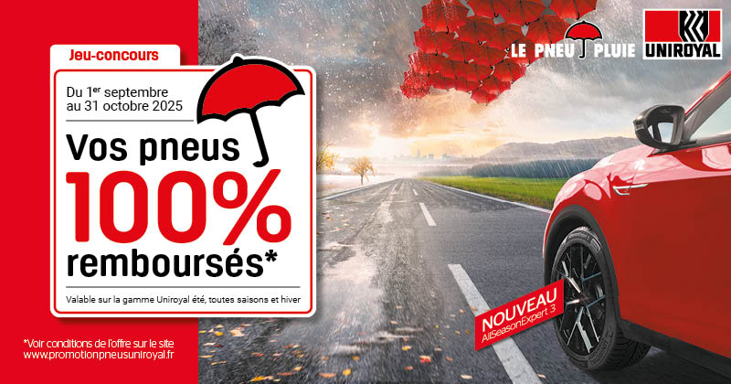 Pour participer au tirage au sort, achetez 2 ou 4 pneumatiques de la marque UNIROYAL (tourisme, 4×4 ou camionnette).